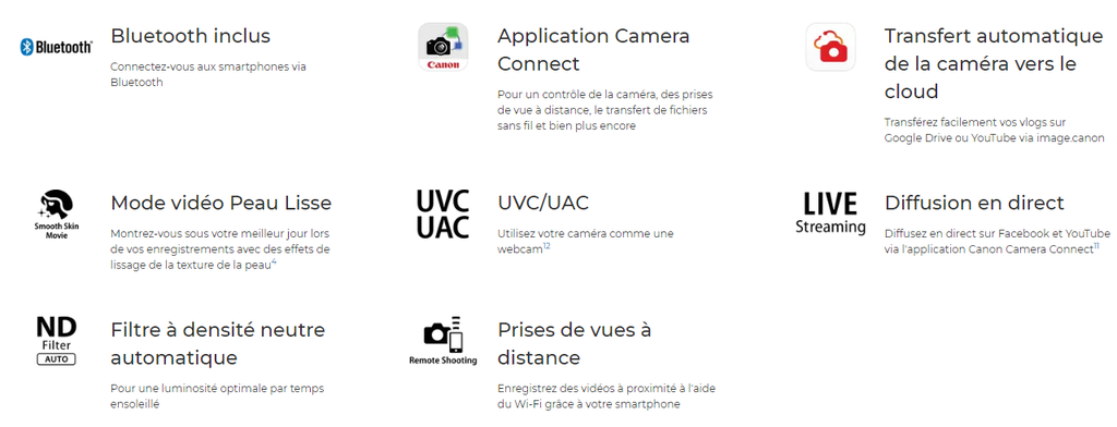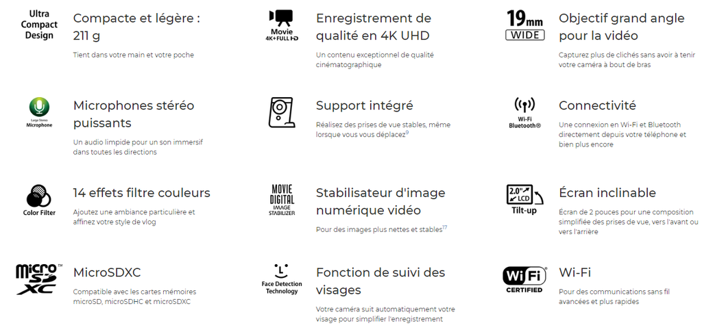 | Sensibilité ISOOpen | Plage ISO automatique pour les vidéos : - Full HD ISO 125 à 6400 (par paliers de 1/3) - 4K ISO 125 à 3200 (par paliers de 1/3) Plage ISO manuelle pour les vidéos avec exposition manuelle : - Full HD ISO 125 à 6400 (par paliers de 1/3) - 4K ISO 125 à 3200 (par paliers de 1/3) Plage ISO automatique pour les photos : ISO 125 à 12.800 (par paliers de 1/3) |