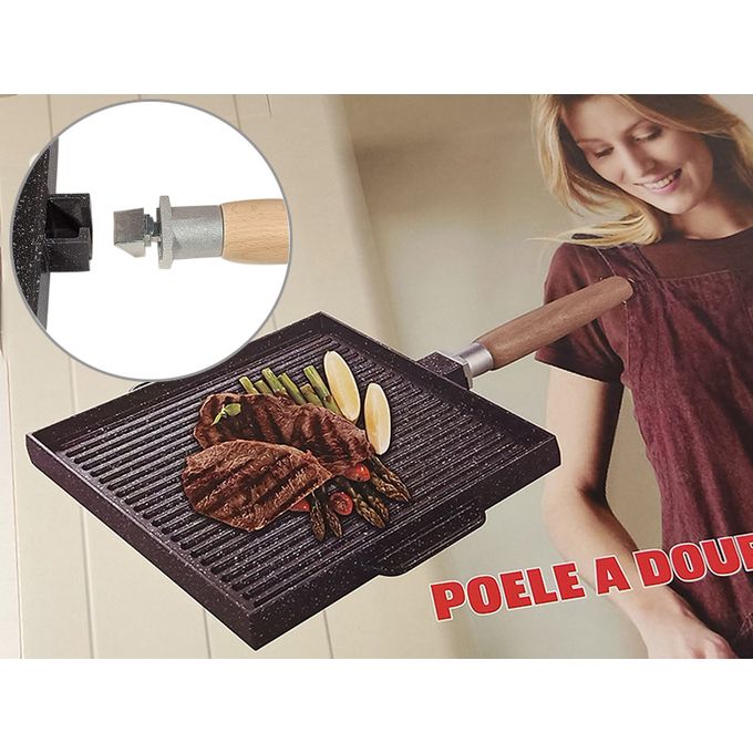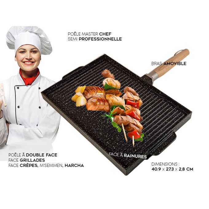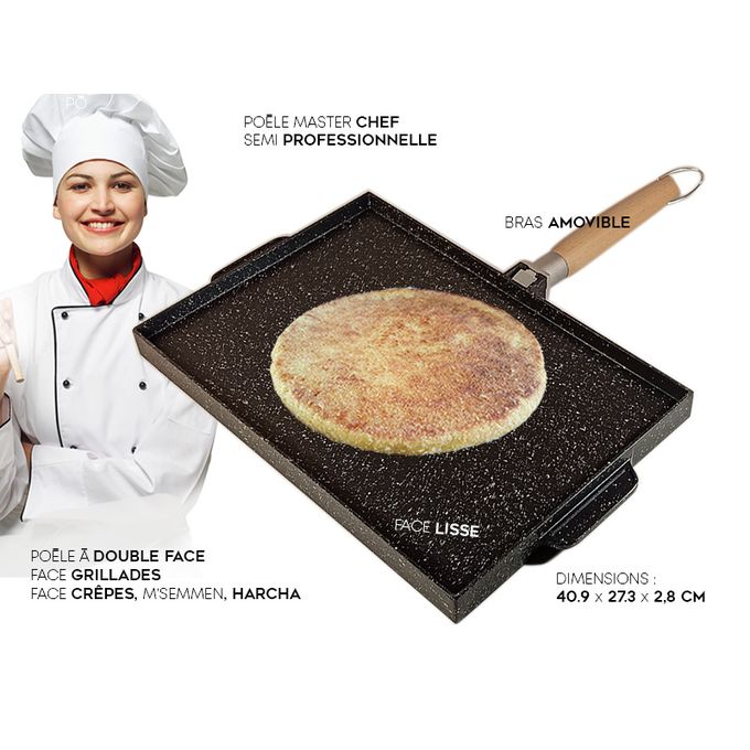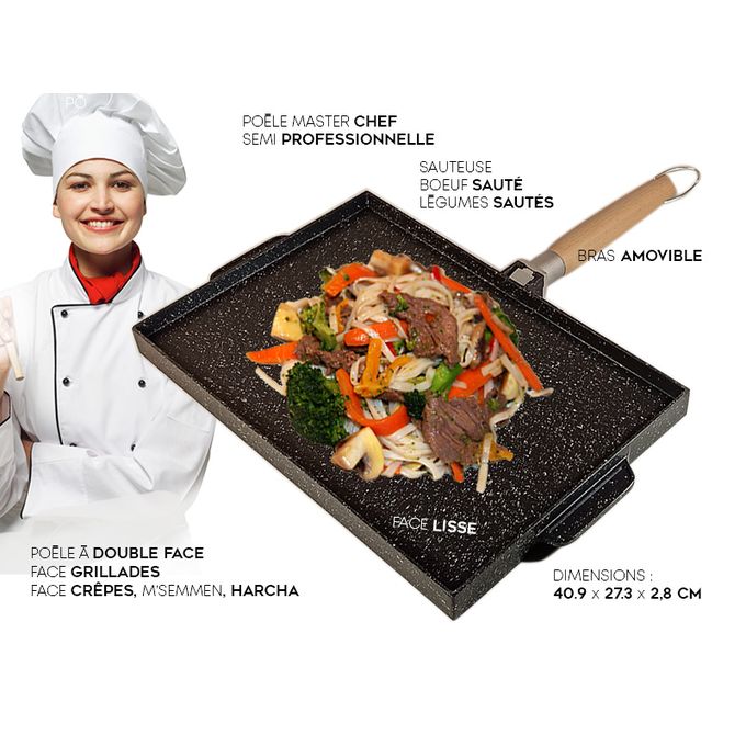 Poêle Semi-professionnelle à 2 Faces en Fonte. Multi-usages, Revêtement Marbre Robuste